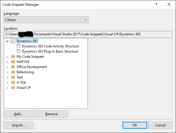 - Importándolas mediante el gestor de snippets de Visual Studio (Ctrl+K; Ctrl+B)